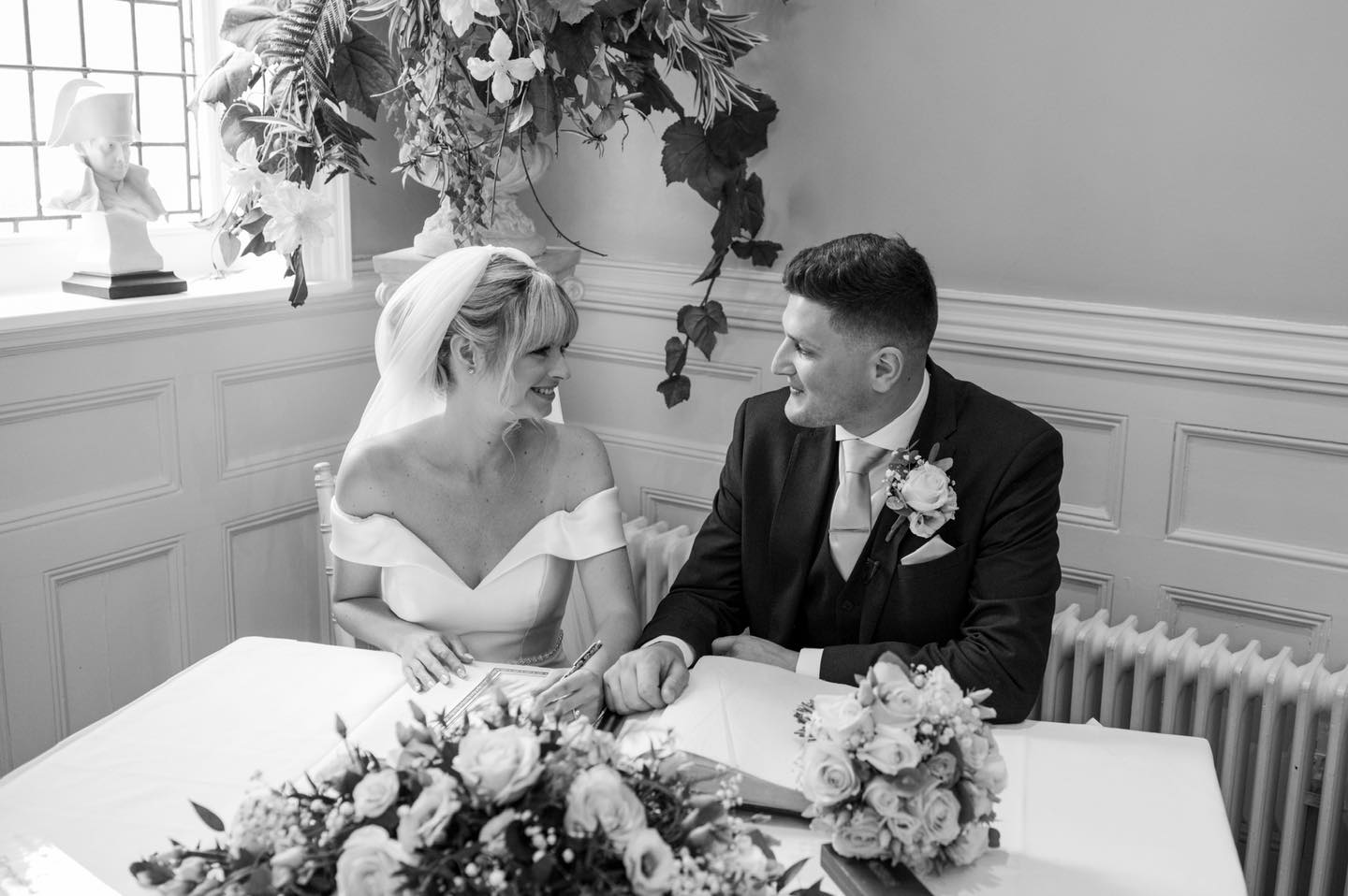 10 Jan Signing the Guild Register Posted at 12:58h in by Nicola 0 Likes Bride and Groom seated at a table, smiling at each other having signed the Guild Register